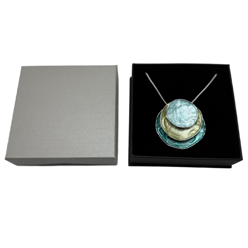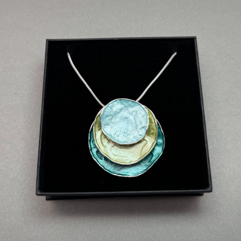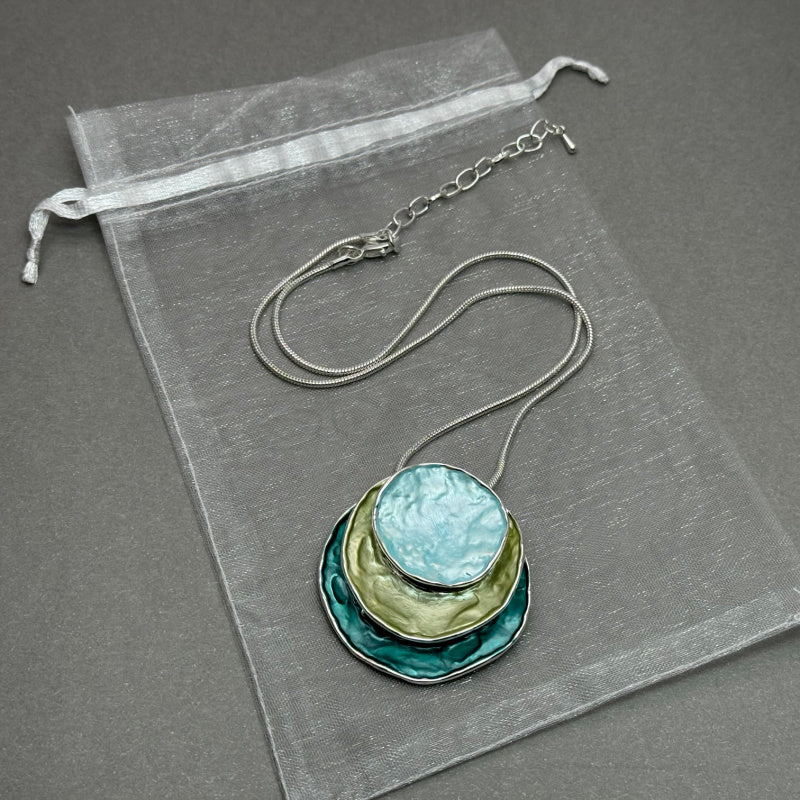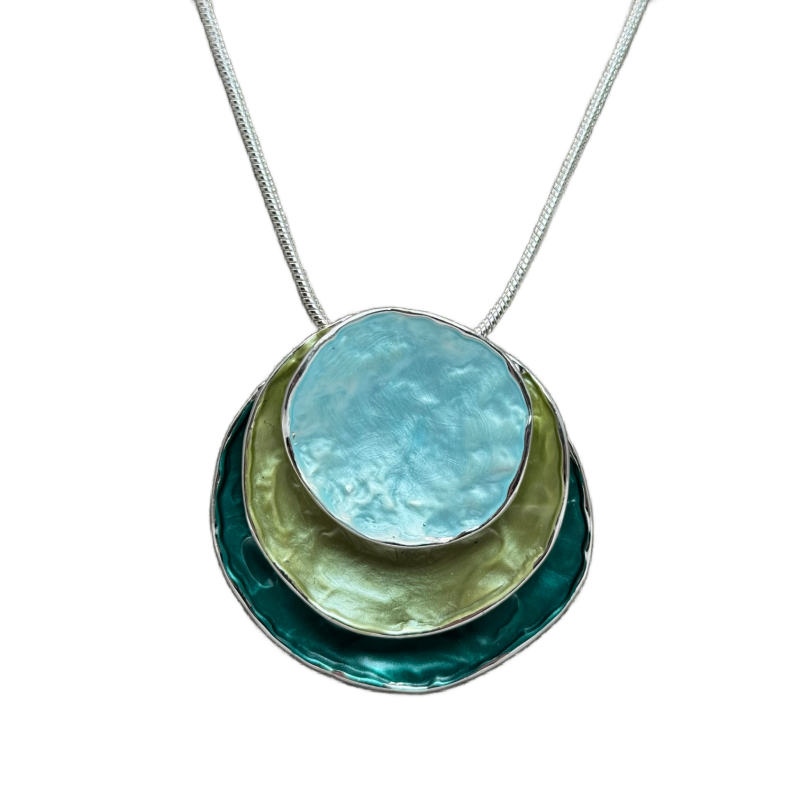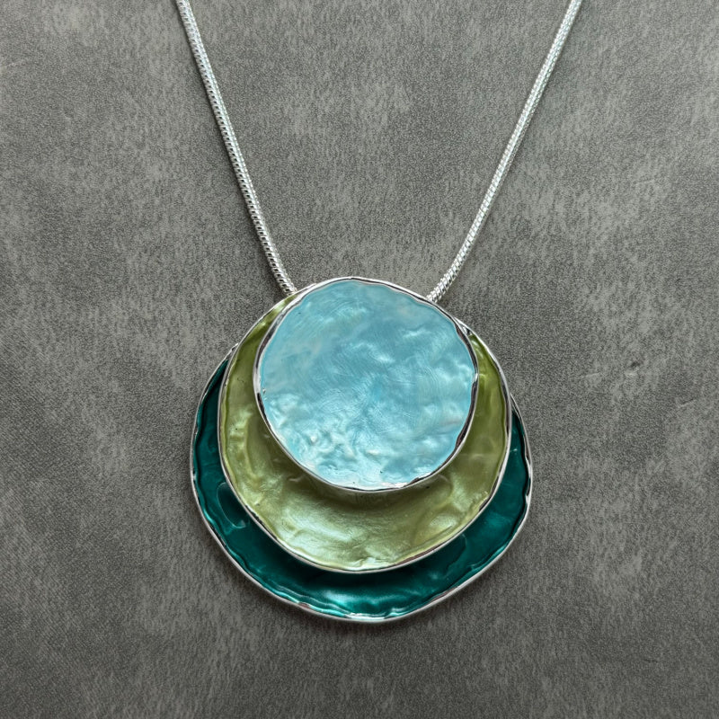 This gorgeous Boho style Enamel Pendant is Zinc Alloy plated with 3 round disc layers of turquoise, pale green and teal.